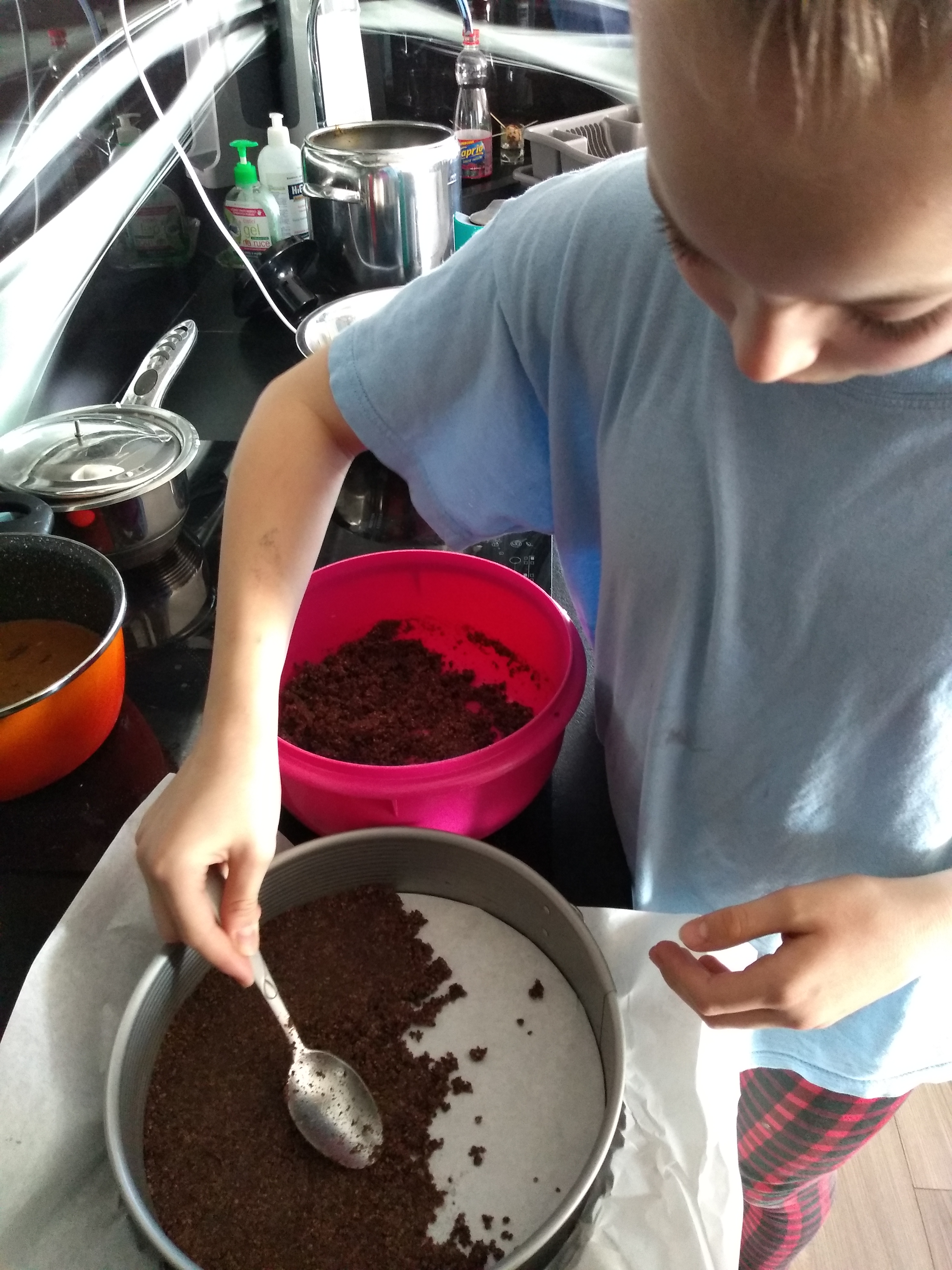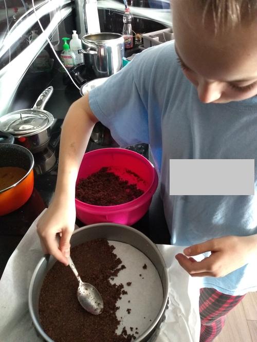 4. Pripravíme si tortovú formu a na spodok si dáme papier na pečenie. Naspodok formy si dáme pripravené sušienky s maslom, popritláčame ich aj ku krajom formy. Na roztlačené sušienky si dáme plnku.