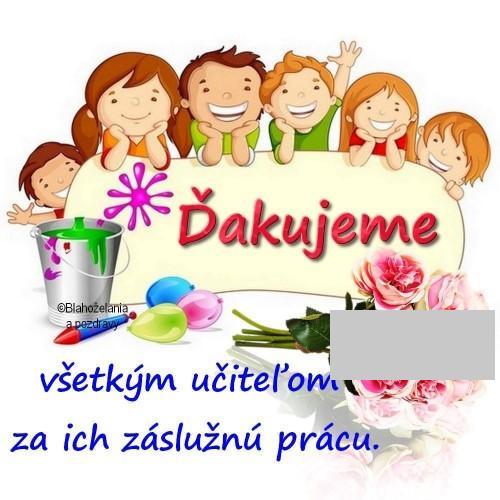 Ku Dňu učiteľov Vám chceme z celého srdca zablahoželať a poďakovať za všetko, čo pre nás robíte. Ďakujeme Vám za porozumenie, za dobrú radu. Aj keď práca učiteľa je veľmi náročná, veľakrát sme Vás aj na nazlostili, no Vy ste k nám boli vždy trpezlivá. Odovzdali ste nám veľa vedomostí i rád, ako sa slušne správať, a preto Vám prajeme veľa šťastia a veľa zdravím naplnených chvíľ, naša milá pani učiteľka.