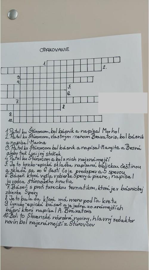 Žiaci VIII.A triedy si na hodine dejepisu zopakovali vedomosti zo štúrovskej generácie. Aktivitu – tajničku si pre nich pripravila ich spolužiačka Alexandra Ďurišová, ktorú chválime a ďakujeme jej za vhodne zvolenú a zostavenú tajničku.