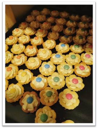 - Upečené kvietky po miernom vychladnutí vyklopíme z formičiek. Po úplnom vychladnutí pomocou cukrárskeho vrecka s ozdobným nástavcom ozdobíme krémom a cukríkmi / lentilkami.