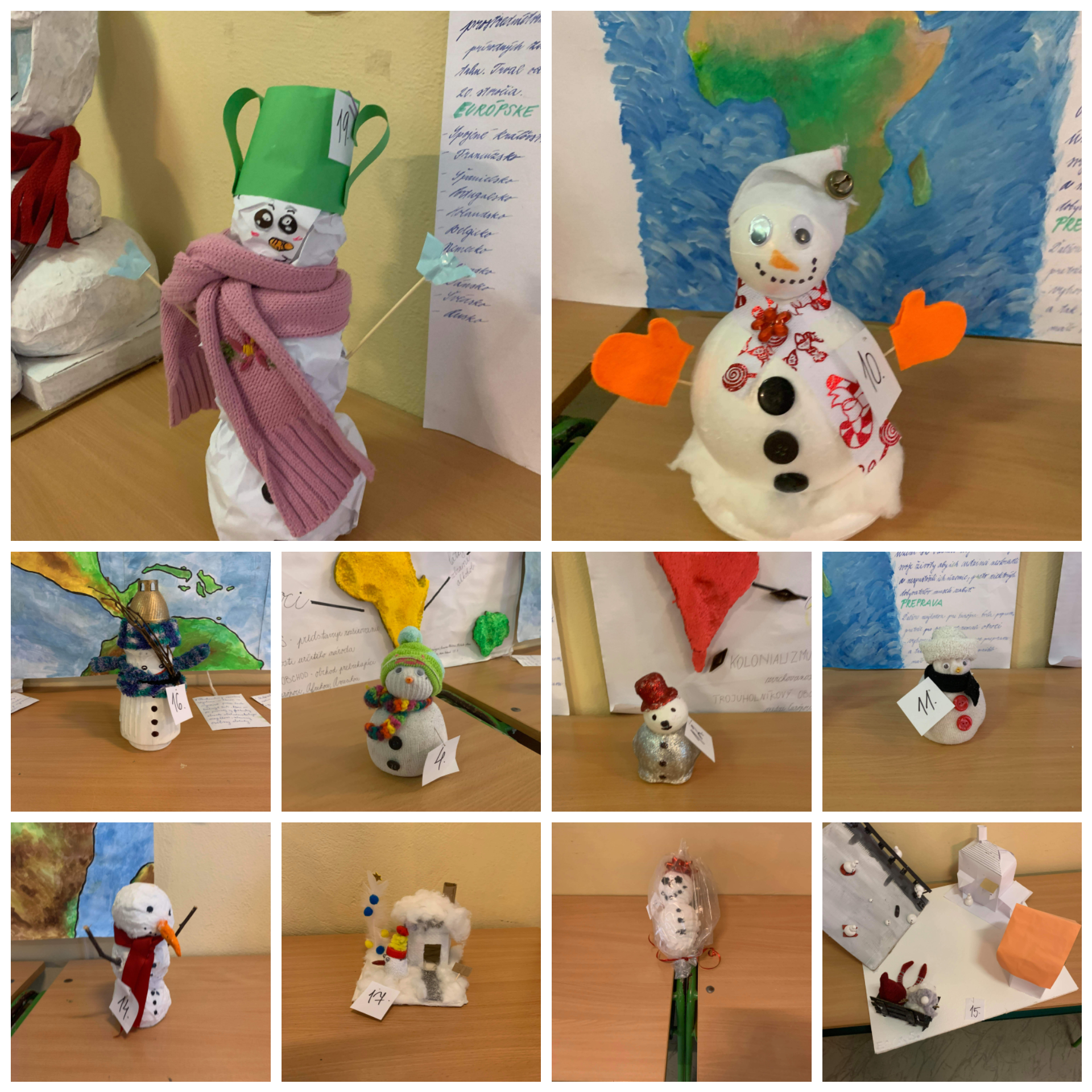 Školské chodby zdobilo 78 snehuliakov vyrobených z rôznych materiálov. Na prvom stupni bolo vystavených 59 snehuliakov a na druhom stupni ich bolo 19.