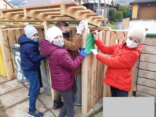 Pred našou školou stojí veľa odpadkových košov. Nie je to nič nezvyčajné, pretože samostatný kôš potrebujeme na komunálny odpad, sklo, papier, či plasty. K týmto košom pribudla napríklad aj "Šiškáreň-" kde hádžeme popadané šišky zo stromov. Aby tieto naše odpadkové koše len tak smutne nepostávali, vyrobili sme im domček z dreva. Najskôr nám ho šikovní ujovia pozbíjali a potom sme prišli na rad my- deti. Natiahli sme si na ruky rukavice, zobrali brúsny papier do ruky a začali sme brúsiť a šmirgľovať drevené laty. Práca išla od ruky dievčatám aj chlapcom. Už sa tešíme keď budeme domčeky maľovať a  skrášlime si ich ešte viac.