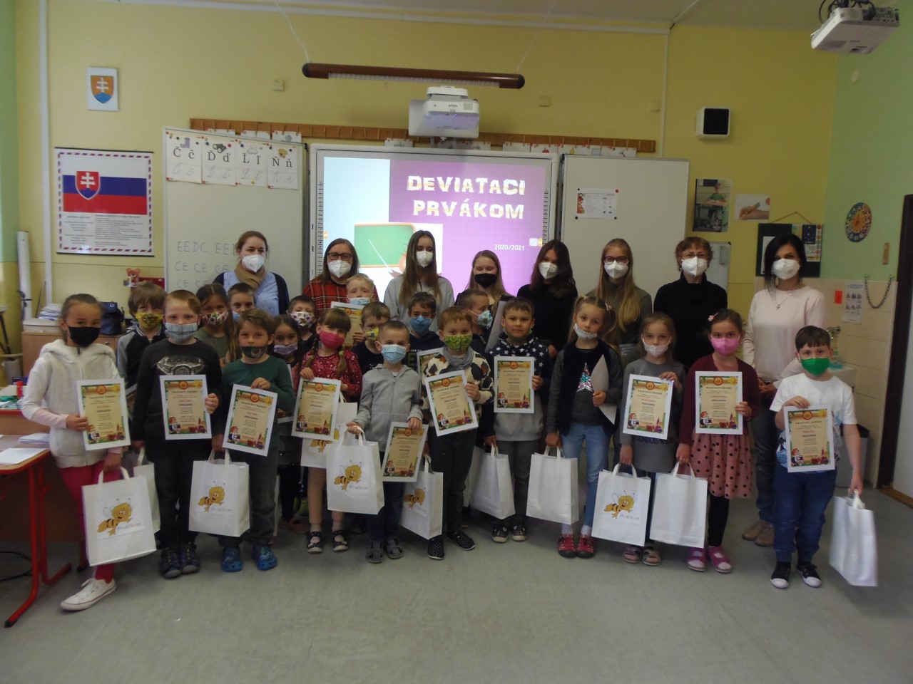 Dňa 13.4.2021 sa už tradične na našej škole konala akcia ,,Deviataci prvákom“. Za prítomnosti pozvanej pani riaditeľky PaedDr. Márie Slosiarikovej a obidvoch triednych pani učiteliek deviatakov, Mgr. Bukovčanovej a Mgr. Sklenkovej s triednou učiteľkou prvákov Mgr. Babiakovou.