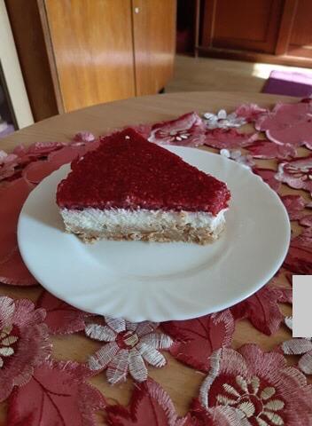 Malinová želatína: Do misky si dáme trocha vody a ponoríme tam 2-3 plátky želatíny a necháme tam cca 10 minút. Maliny dáme aj s cukrom a vodou do hrnca a necháme prevrieť. Keď prevrú, prepasírujeme ich cez sitko a do malinovej šťavy pridáme želatínu. Premiešame a pridáme maliny, ktoré máme v sitku. Želatínu vylejeme na cheesecake a dáme vychladnúť cca 2 hodiny. Tak dobrú chuť.
