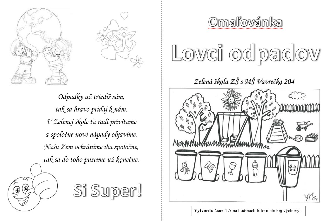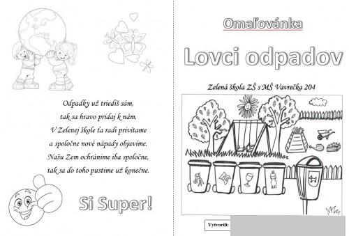 Každoročne pribúdajú do nášho školského kolektívu aj maličkí žiaci- prváčikovia. Zoznamujú sa s novou triedou, radostne si obzerajú nových spolužiakov, či pani učiteľku. Učia sa novým pravidlám, spoznávajú písmenká či čísla. Aby toho nebolo málo, hneď sme ich oboznámili aj s našim cieľom- byť Zelenou školou. Druháci si pre prvákov pripravili zaujímavé aktivity o triedení odpadkov v našej škole. Spoločne si pozreli aj krátku animovanú rozprávku Recyklónia, v ktorej bolo množstvo užitočných rád o triedení a recyklovaní odpadu. Keďže prváčikovia úžasne pracovali a triedili odpadky, zaslúžili si odmenu. Každý si odniesol omaľovánku Lovci odpadov, ktorú vytvorili štvrtáci na hodinách informatickej výchovy. Sme radi, že už každý žiak v našej škole dokáže nielen minimalizovať množstvo odpadkov, ale ich aj správne triediť.