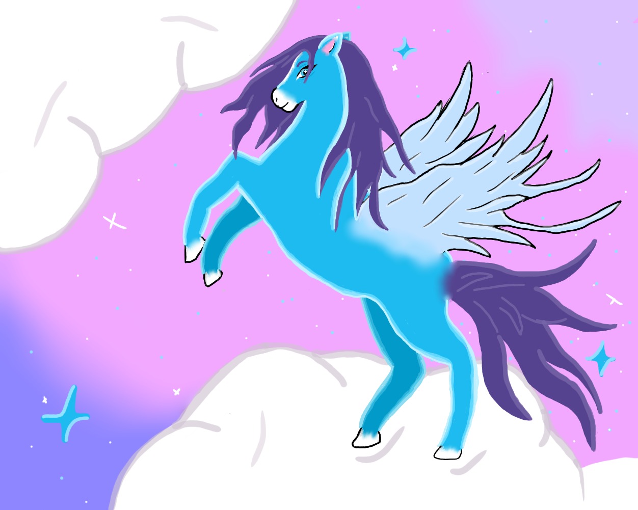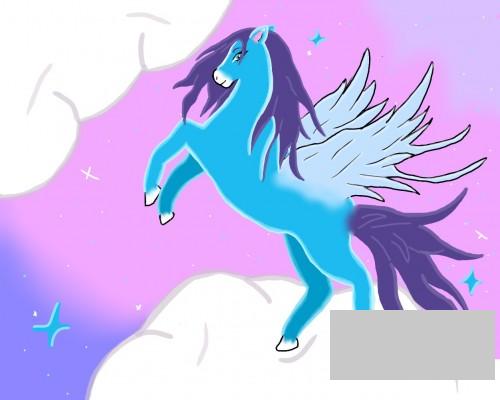 Vtom sa z ničoho nič strhla veterná smršť. Nechápala som, čo sa stalo a pokým som nad tým rozmýšľala, kôň ma nabral na chrbát a hlasito zaerdžal. Silno som sa prichytila jeho hrivy, aby som nespadla. Rozbehol sa a tesne pri konci brehu vyskočil. Myslela som, že spadneme do vody, tak som len rýchlo zatvorila oči a modlila sa. No vtom som si uvedomila, že skáčeme stále viac a viac. V tom momente som bola zmätená tak, ako nikdy predtým, ale na moje počudovanie, vôbec som necítila strach. Len voľnosť. Pozrela som sa dolu, chcela som zistiť, či je niečo pod nami alebo už naozaj bláznim. No keď som sklonila zrak, videla som rovnakú modrú, ako boli jeho oči. Lenže tentokrát ju mal po celom tele a svietila oveľa silnejšie. Táto modrá ma už však dokázala oslepiť...