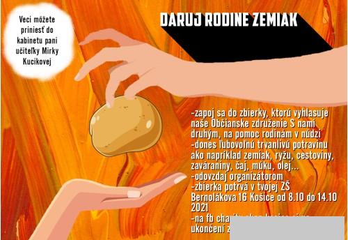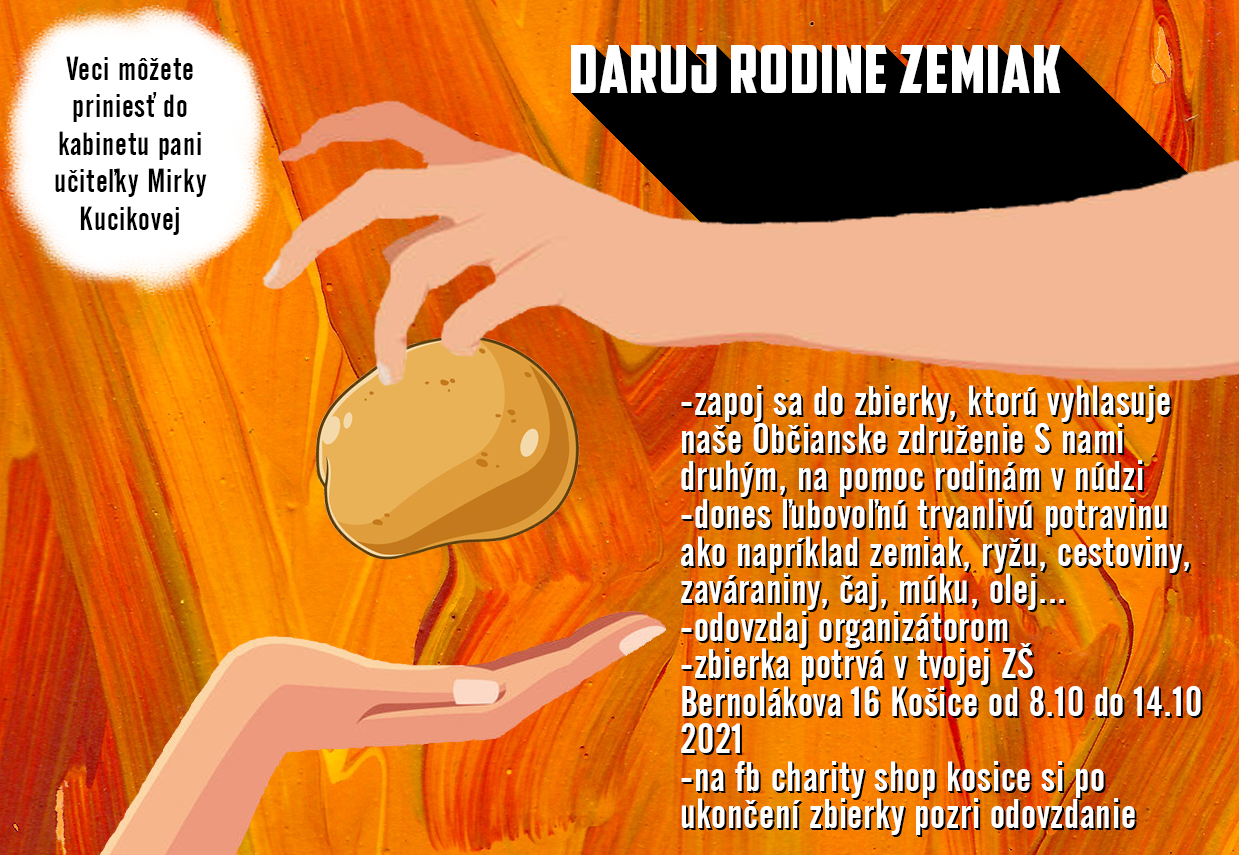 Charitatívnu zbierku "DARUJ RODINE ZEMIAK" už možno poznáte. I tento rok sme sa rozhodli, že budeme na pomoci a zrealizujeme zbierku, ktorej súčasťou môžete byť i VY. Cení sa akákoľvek trvanlivá potravina, ktorú môžeš priniesť do kabinetu pani učiteľky Mirky Kucikovej.